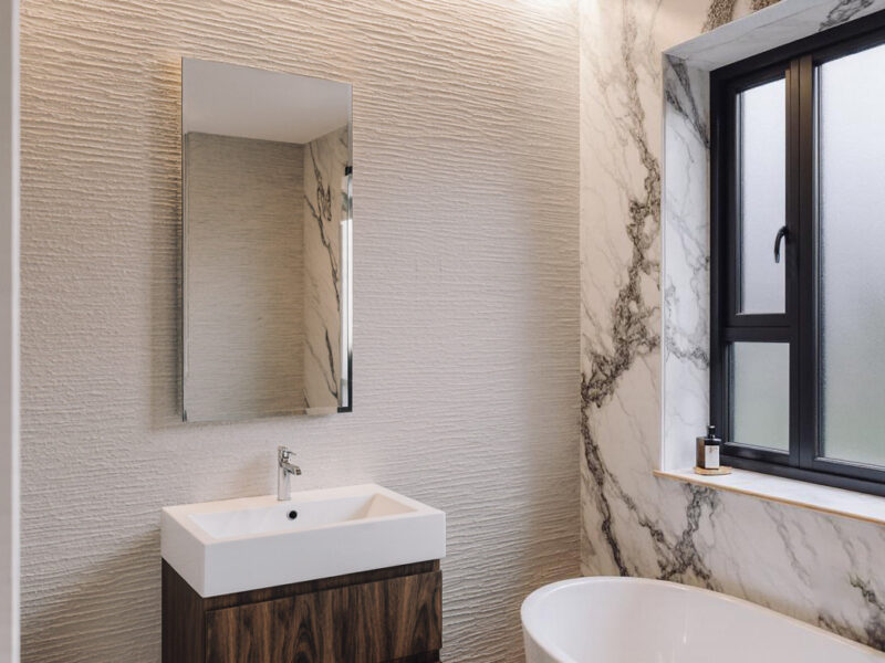 Il bagno principale unisce superfici materiche e marmo pregiato, con una parete traforata retroilluminata che diventa elemento scenografico. Il lavabo in ceramica bianca, appoggiato su un mobile in legno scuro, e lo specchio minimalista contribuiscono a un ambiente elegante e luminoso.