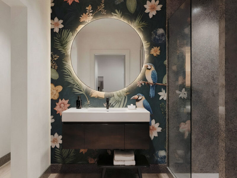 Il secondo bagno introduce un linguaggio più decorativo, grazie a una carta da parati tropicale che dona carattere allo spazio. Gli arredi sospesi, la doccia in vetro e il lavabo dalle linee moderne mantengono un equilibrio pulito e contemporaneo.