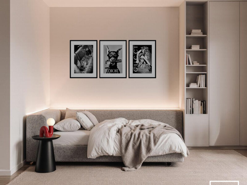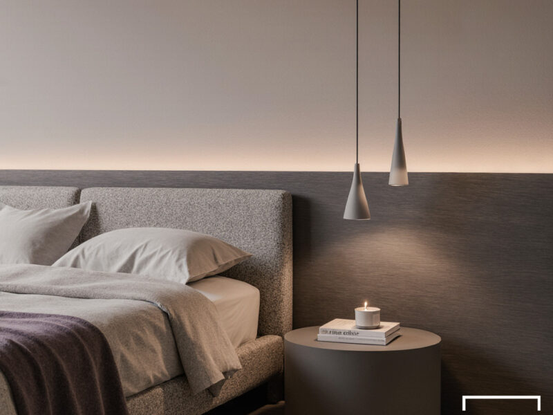La camera da letto avvolge in un’atmosfera calma e rilassante, con un letto in tessuto bouclé grigio chiaro, tonalità neutre e un’illuminazione calda ottenuta da lampade a sospensione minimal. Le fotografie in bianco e nero alle spalle del letto aggiungono una nota elegante e contemporanea.
