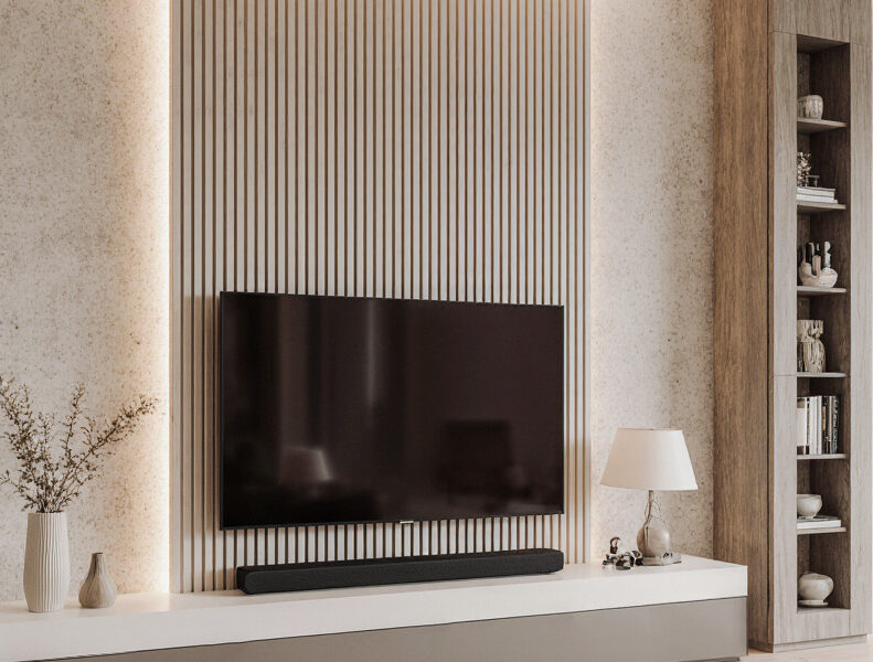 La zona TV presenta una parete attrezzata in legno chiaro con doghe retroilluminate, che conferiscono profondità e ritmo allo spazio. Elementi decorativi discreti completano l’ambiente, mantenendo un’estetica ordinata e funzionale.