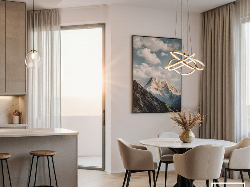 La zona pranzo e la cucina open space dialogano attraverso materiali e colori armonici: un tavolo rotondo con sedie imbottite beige, una lampada a sospensione di design e grandi vetrate che filtrano la luce naturale. La cucina, dalle superfici essenziali, è resa più accogliente dal contrasto tra i toni neutri e gli elementi in legno.