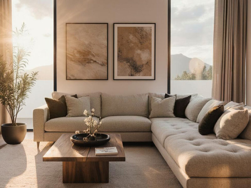 La zona living rappresenta il cuore della casa: un ampio divano angolare in toni neutri dialoga con grandi finestre verticali che illuminano lo spazio con luce naturale. La palette calda è completata da quadri astratti, un tavolino in legno massello e un tappeto chiaro che definisce l’area con morbidezza.