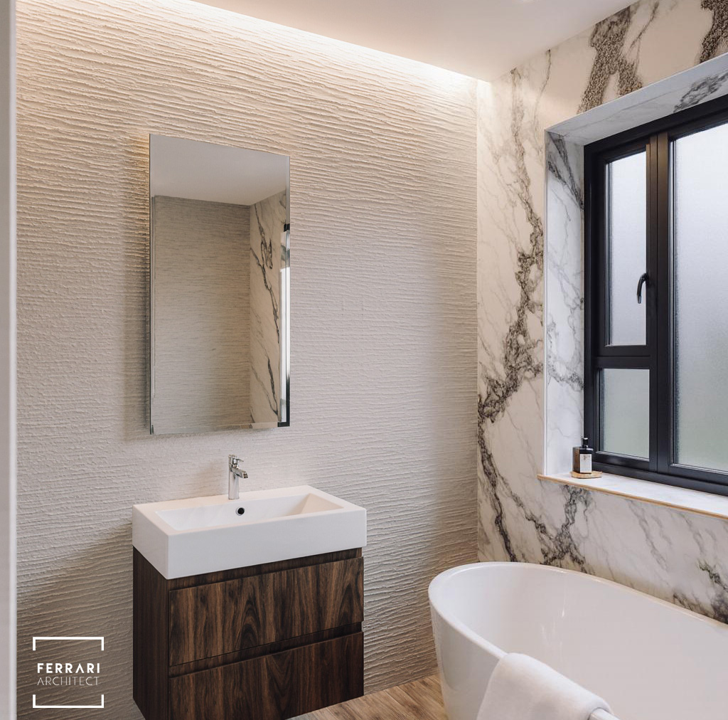 Il bagno principale unisce superfici materiche e marmo pregiato, con una parete traforata retroilluminata che diventa elemento scenografico. Il lavabo in ceramica bianca, appoggiato su un mobile in legno scuro, e lo specchio minimalista contribuiscono a un ambiente elegante e luminoso.
