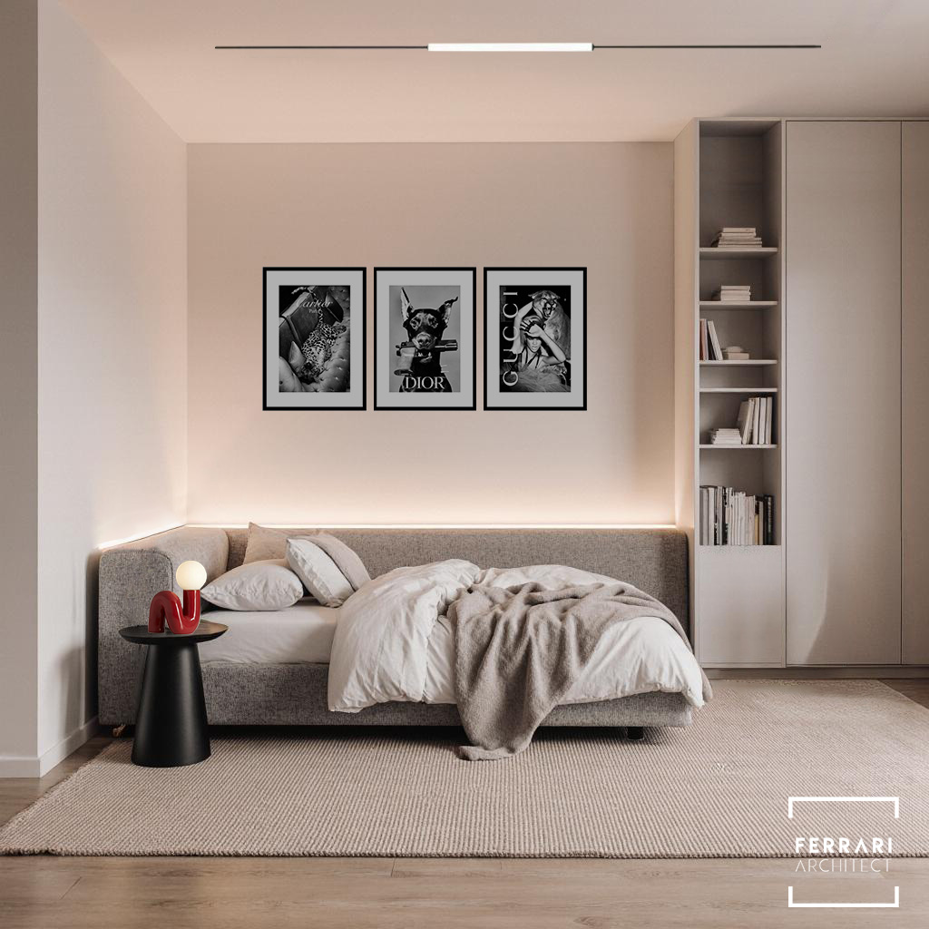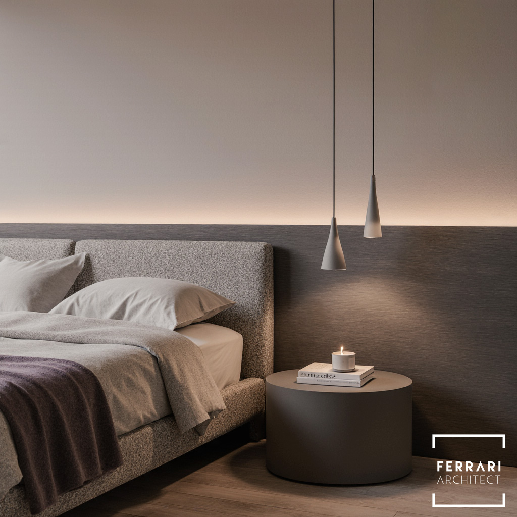La camera da letto avvolge in un’atmosfera calma e rilassante, con un letto in tessuto bouclé grigio chiaro, tonalità neutre e un’illuminazione calda ottenuta da lampade a sospensione minimal. Le fotografie in bianco e nero alle spalle del letto aggiungono una nota elegante e contemporanea.