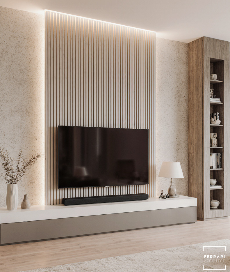 La zona TV presenta una parete attrezzata in legno chiaro con doghe retroilluminate, che conferiscono profondità e ritmo allo spazio. Elementi decorativi discreti completano l’ambiente, mantenendo un’estetica ordinata e funzionale.