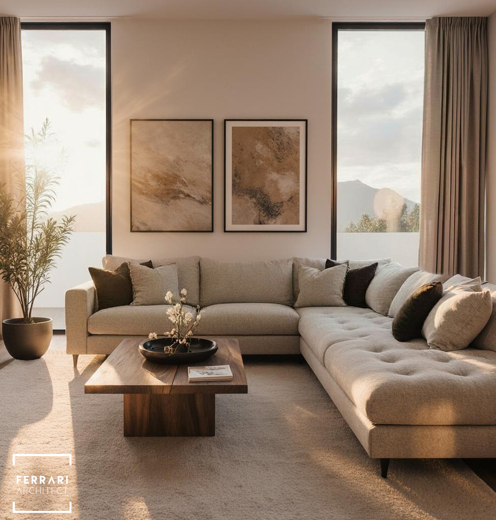 La zona living rappresenta il cuore della casa: un ampio divano angolare in toni neutri dialoga con grandi finestre verticali che illuminano lo spazio con luce naturale. La palette calda è completata da quadri astratti, un tavolino in legno massello e un tappeto chiaro che definisce l’area con morbidezza.