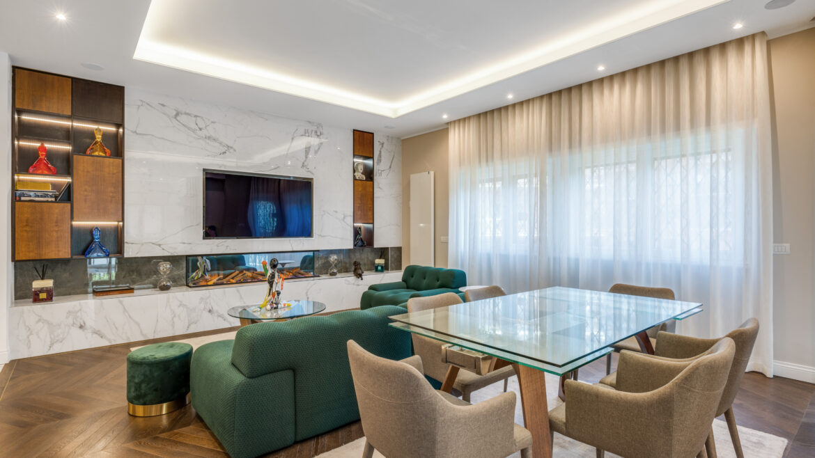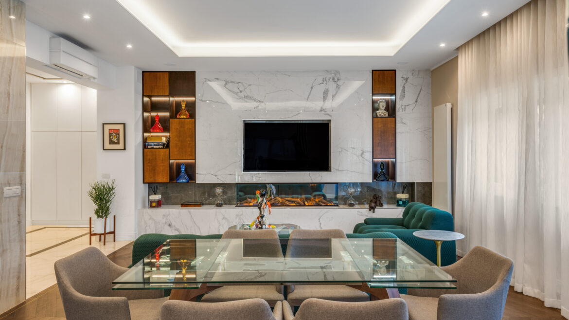 «L’area giorno e la zona notte sono dotate di un sistema audio personalizzato all’interno del controsoffitto appositamente studiato per ospitare sia la diffusione audio che diverse tipologie di illuminazione .Il televisore è incassato insieme a tutte le componenti che la riguardano all’interno della parete attrezzata nello zona giorno. Il camino elettrico con una base su misura emerge dal basamento rivestimento in gres ed è l’unico elemento che unisce la parte alta e basa della parete. L’intento era quello di creare uno spazio aperto, luminoso e dall’estetica contemporanea e glamour. Tutti gli arredi sono pensati per rendere l’ambiente funzionale e di spessore illuminato alla sera da una luce dall’alto dei faretti direzionali e da una luce a led leggera e dimmerabile che fuoriesce dalle velette, creando un ambiente morbido e rilassante».