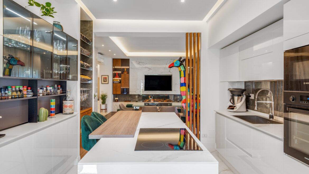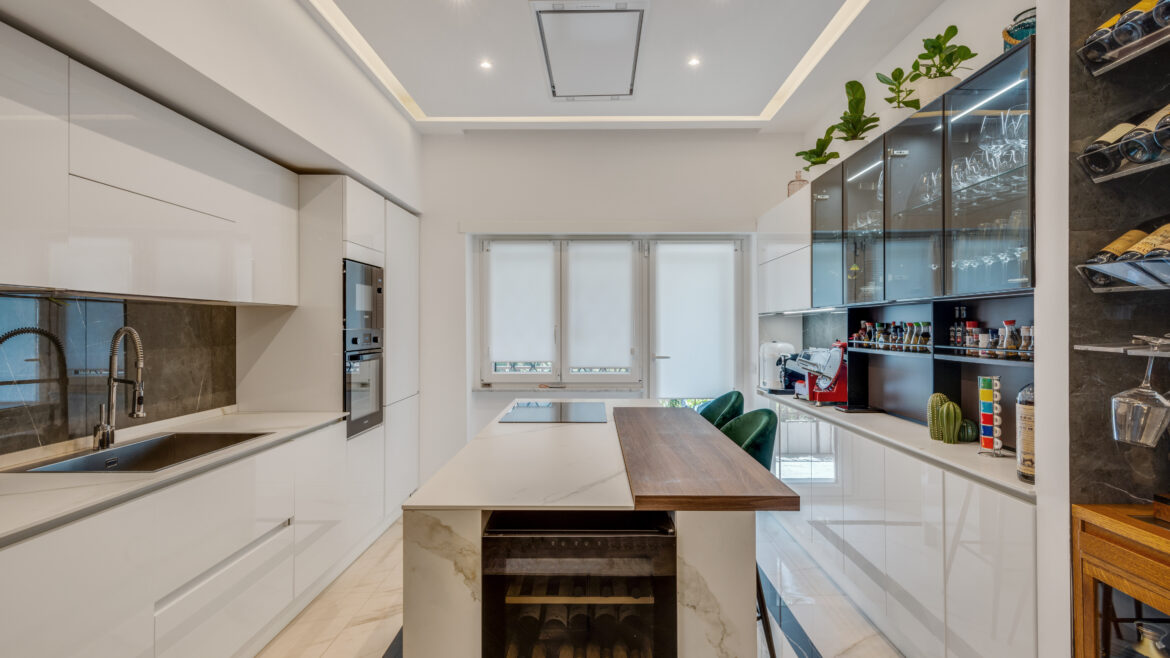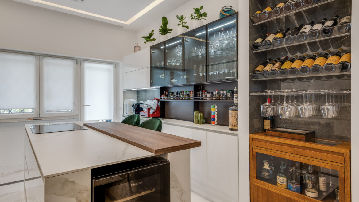 La cucina in stile minimal, presenta superfici chiare e vetri nero fumè per rendere lo spazio elegante e contemporaneo con due cantinette dedicate
