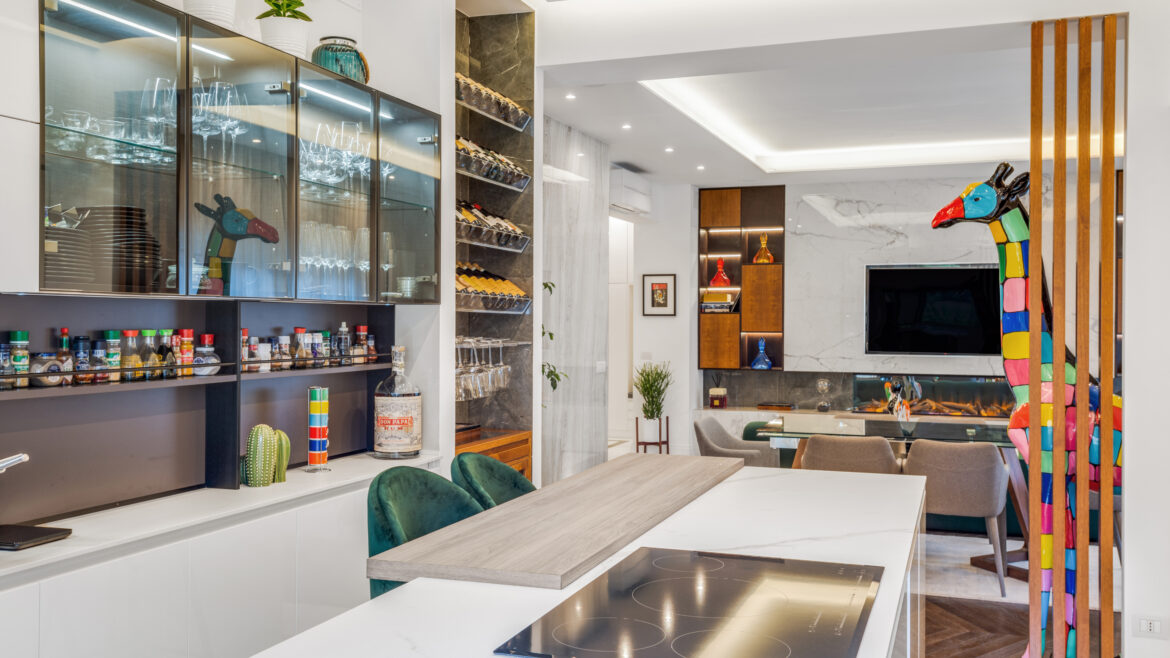 «L’idea è quella di tenere una palette piuttosto semplice per accentuare e dare spazio anche alla finitura degli arredi. I pavimenti sono in rovere tabacco e gres in calacatta gold con cornici nero marquinia, molte delle pareti sono semplicemente bianche altre rivestite in gres Onice, illuminate da terra. La parete attrezzata è rivestita in gres bianco e legno di rovere ed ospita due librerie, il televisore incassato e un caminetto elettrico ultra HD. La parete ha un ruolo importante, perché oltre a custodire tutte le essenze e le finiture utilizzate nel progetto, rappresenta la zona multimediale, nascondendo in sè tutti i componenti informatici e di domotica. La cucina dallo stile minimal è inserita all’interno di una stanza completamente bianca, serve a regalare profondità all’ambiente a trasportare quanta più luce possibile nella zona living dalla finestra esposta a sud-est .