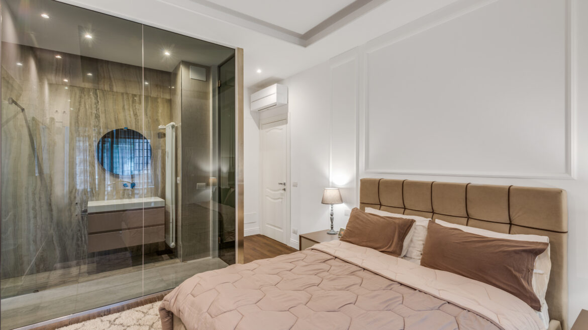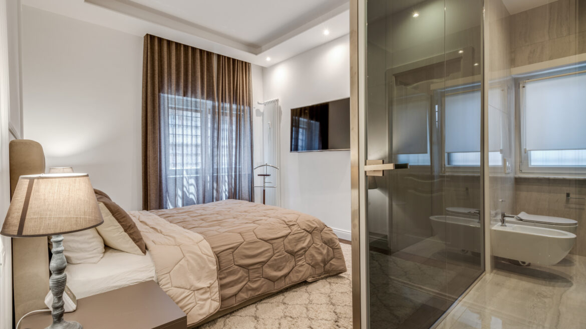 La camera padronale ospita un bagno in camera completamente vetrato, in cui trovano privacy e rifugio solo i servizi sanitari.