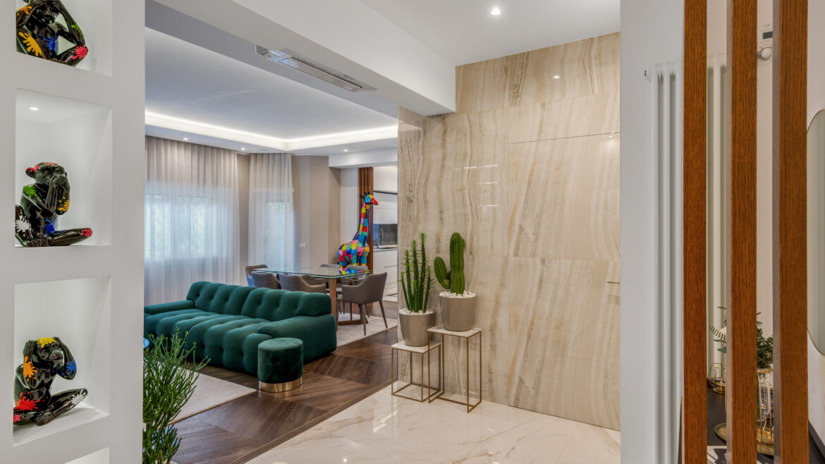 L’ingresso della residenza di Roma progettato dallo studio si apre con una vista piena di luce snaturale sulla zona living curata in ogni suo dettaglio .