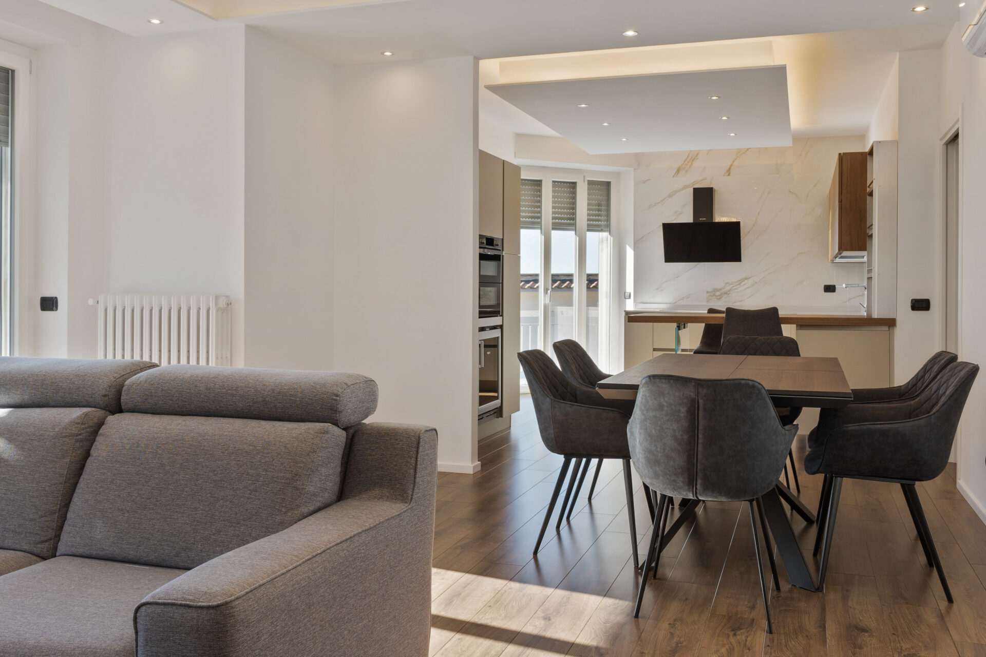 La zona living si presenta come un ambiente aperto e luminoso, dominato da una parete scenografica in marmo bianco che integra camino e TV. Arredi essenziali in legno scuro e divani chiari definiscono un’atmosfera sofisticata e conviviale, in continuità visiva con cucina e zona pranzo.