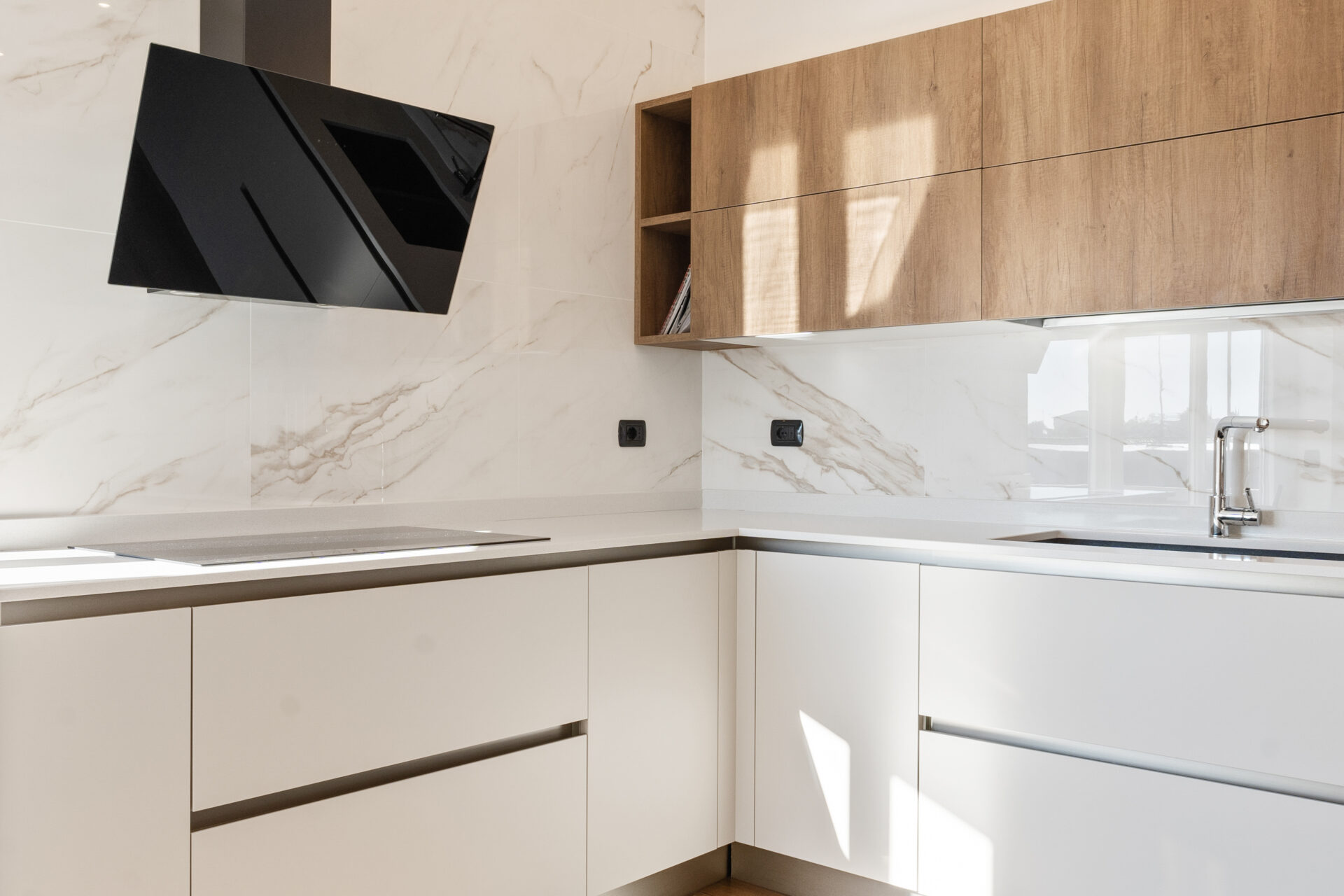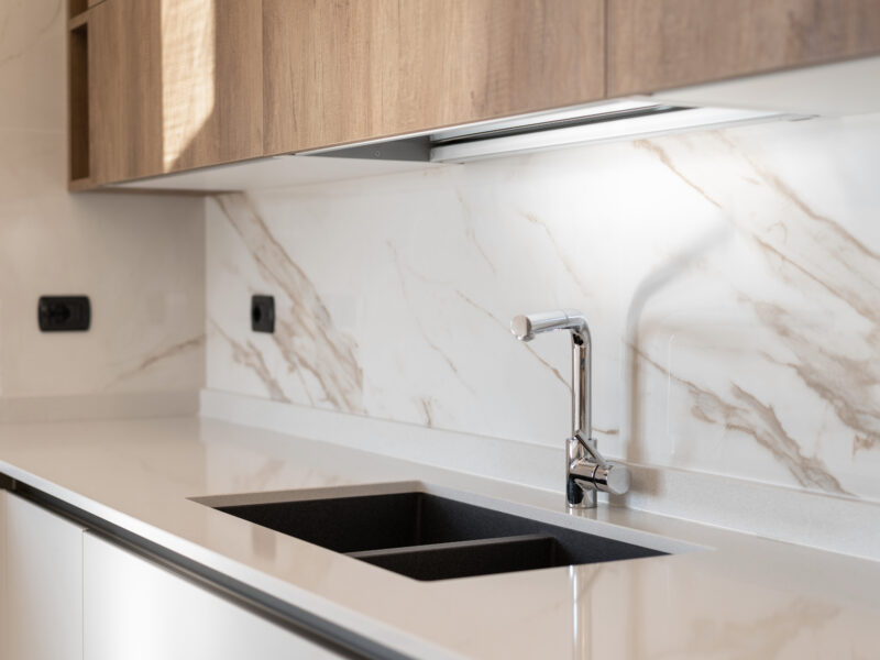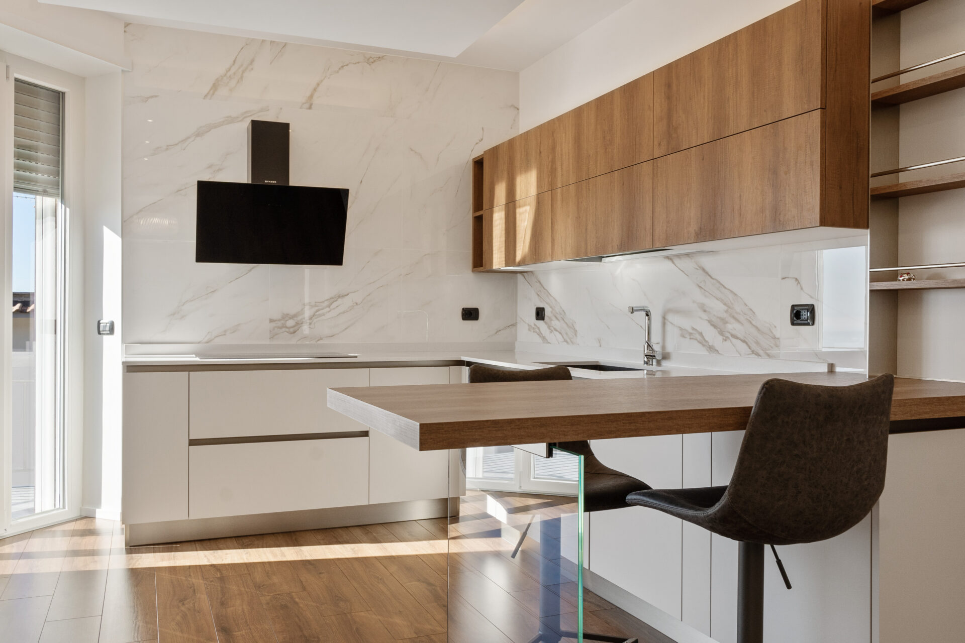 Il concept generale si fonda su una continuità materica misurata: marmo, legno e tessuti neutri compongono il fil rouge dell’abitazione, mentre l’illuminazione—naturale e artificiale—accentua texture, superfici e comfort percettivo.