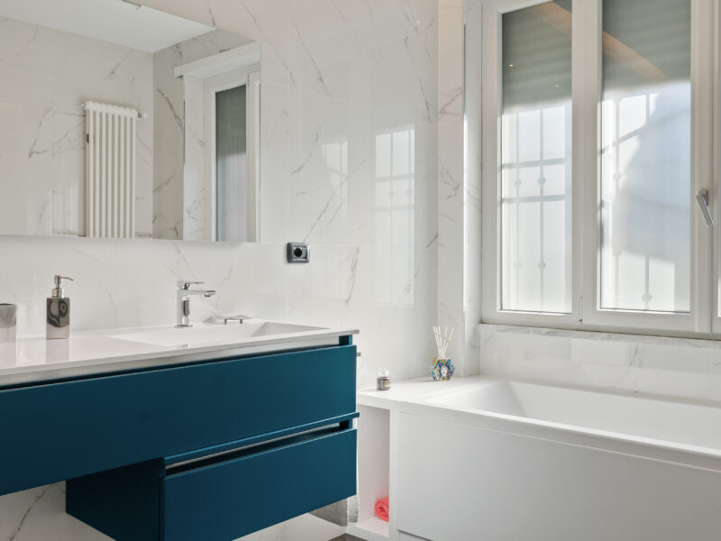 Il bagno doppio mette in scena un raffinato dialogo materico tra marmo bianco venato e superfici verticali in marmo nero, valorizzato da specchi ovali con cornice dorata ed elementi vegetali. Un’illuminazione calibrata esalta le finiture e contribuisce a un’atmosfera rilassante.