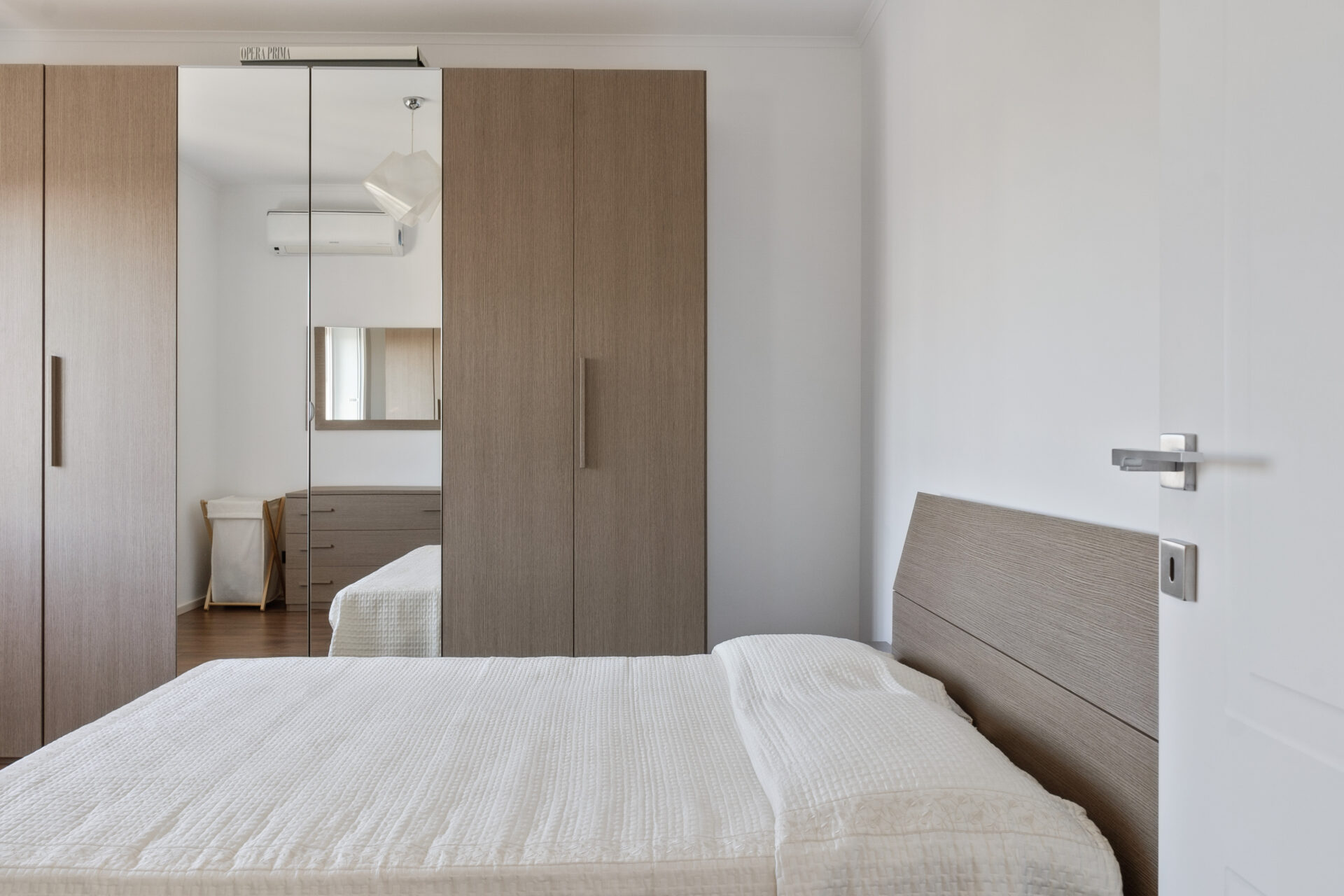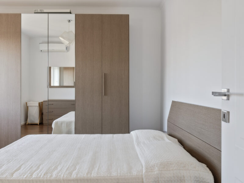 La camera da letto padronale è caratterizzata da toni morbidi, tessuti naturali e un ampio letto rivestito in fibra naturale. Le opere astratte e la cabina armadio retroilluminata con ante in vetro uniscono estetica e funzionalità, mantenendo coerenza con il linguaggio dell’intera casa.
