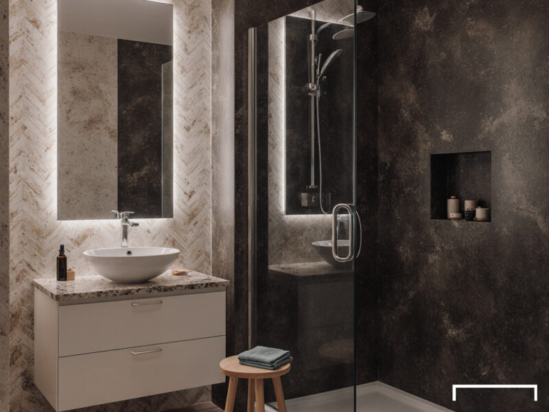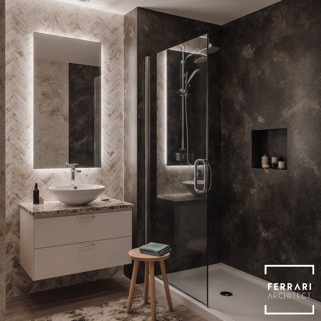 Il BAGNO si distingue per un design elegante, definito da pareti in pietra chiara posate a spina di pesce che creano un effetto visivo dinamico e raffinato. Il lavabo a ciotola bianco si posa su un mobile sospeso minimale, mentre uno specchio retroilluminato diffonde una luce morbida che valorizza le superfici. La doccia in vetro trasparente, abbinata a pareti effetto pietra scura, introduce un contrasto materico ricercato e contemporaneo.