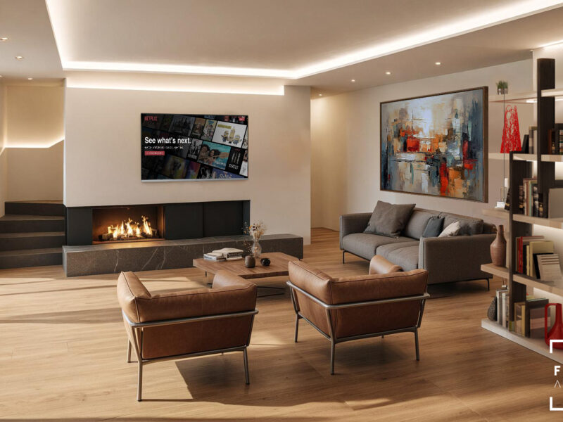 Lo SPAZIO LIVING è ampio e luminoso, caratterizzato da un camino lineare incassato e pavimenti in legno chiaro che donano calore e naturalezza. L’illuminazione LED perimetrale crea un’atmosfera rilassante, mentre divani e poltrone in tessuti neutri si armonizzano con arredi dai toni sobri. Le grandi vetrate scorrevoli aprono verso il giardino, amplificando luminosità e continuità, mentre opere d’arte astratte aggiungono un tocco di personalità.