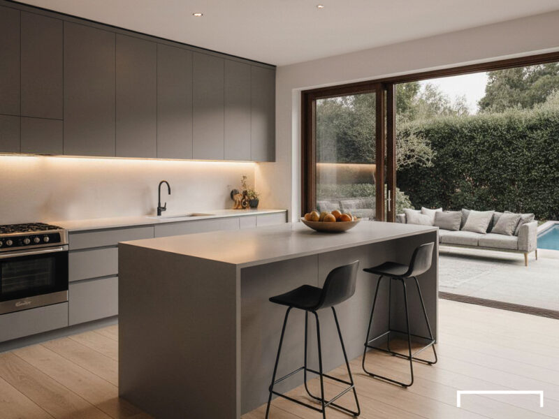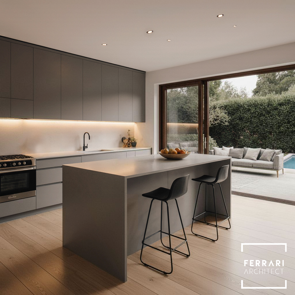 La CUCINA si sviluppa attorno a un’isola centrale grigio scuro opaco, con basi e pensili privi di maniglie che esaltano la pulizia delle linee. L’illuminazione lineare sotto i pensili migliora la funzionalità dell’area di lavoro, mentre le ampie vetrate mettono in relazione diretta cucina, giardino e piscina. Un bar con sgabelli neri completa lo spazio con un tocco conviviale e contemporaneo.