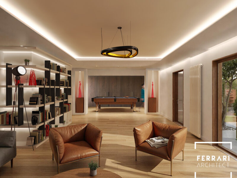 La ZONA RELAX è concepita come un living elegante, con libreria a vista e arredi contemporanei come poltrone in pelle cognac e un divano grigio scuro disposti intorno a un tavolino rotondo in legno. Le luci LED integrate nel soffitto sagomato e un lampadario moderno sospeso creano un equilibrio tra calore e modernità, mentre opere d’arte e dettagli curati donano carattere e identità allo spazio.