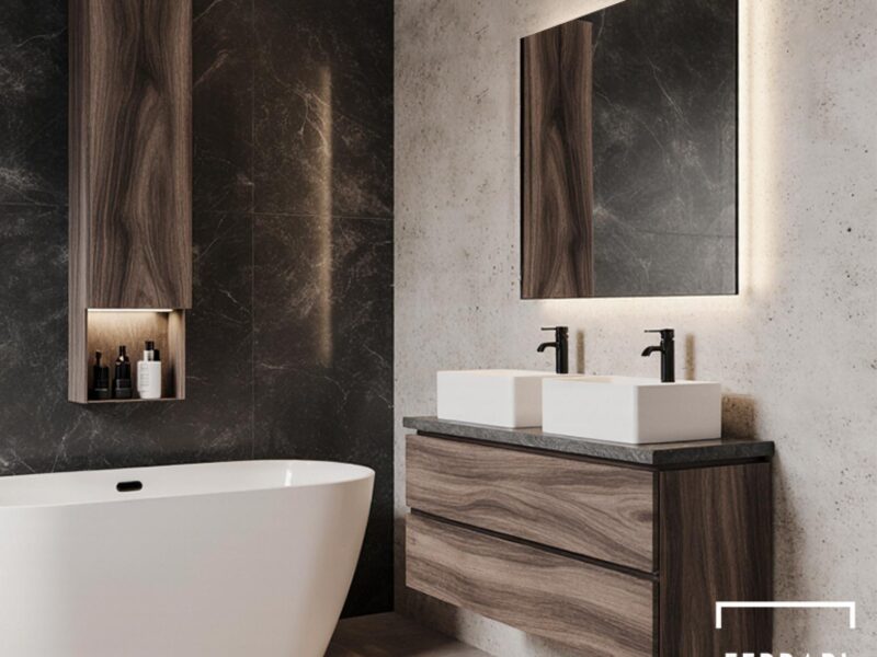 Il BAGNO si distingue per superfici effetto pietra scura lucida abbinate a elementi in legno naturale scuro, che conferiscono profondità e una sensazione calda e accogliente. Il lavabo doppio poggia su un piano in pietra scura, generando un contrasto materico elegante, mentre l’illuminazione indiretta dietro lo specchio esalta le texture e diffonde una luce soffusa e sofisticata.