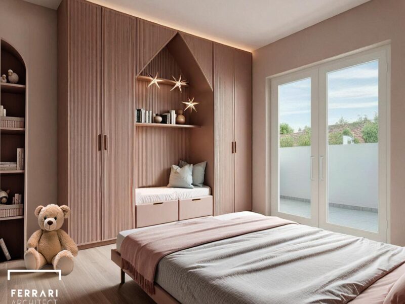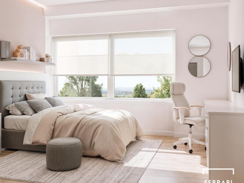 La CAMERA DA LETTO diventa un’oasi di relax, con tonalità neutre e calde, pavimenti in legno chiaro e tessili morbidi che invitano al comfort. Le ampie finestre con tende leggere favoriscono la luce naturale, mentre il letto imbottito e un grande tappeto soffice definiscono l’area notte. L’armadio a muro, integrato nell’arredo, mantiene linee pulite e finiture neutre, garantendo funzionalità senza appesantire lo spazio.