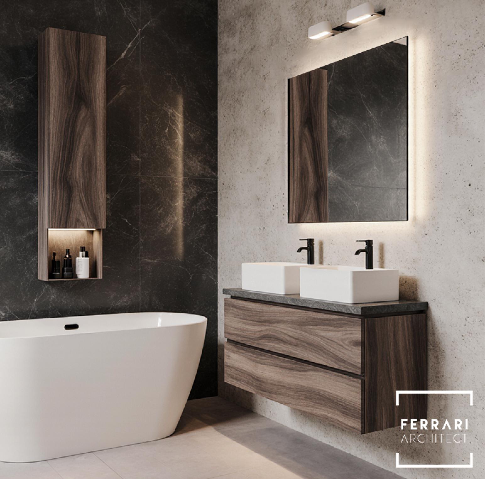 Il BAGNO si distingue per superfici effetto pietra scura lucida abbinate a elementi in legno naturale scuro, che conferiscono profondità e una sensazione calda e accogliente. Il lavabo doppio poggia su un piano in pietra scura, generando un contrasto materico elegante, mentre l’illuminazione indiretta dietro lo specchio esalta le texture e diffonde una luce soffusa e sofisticata.