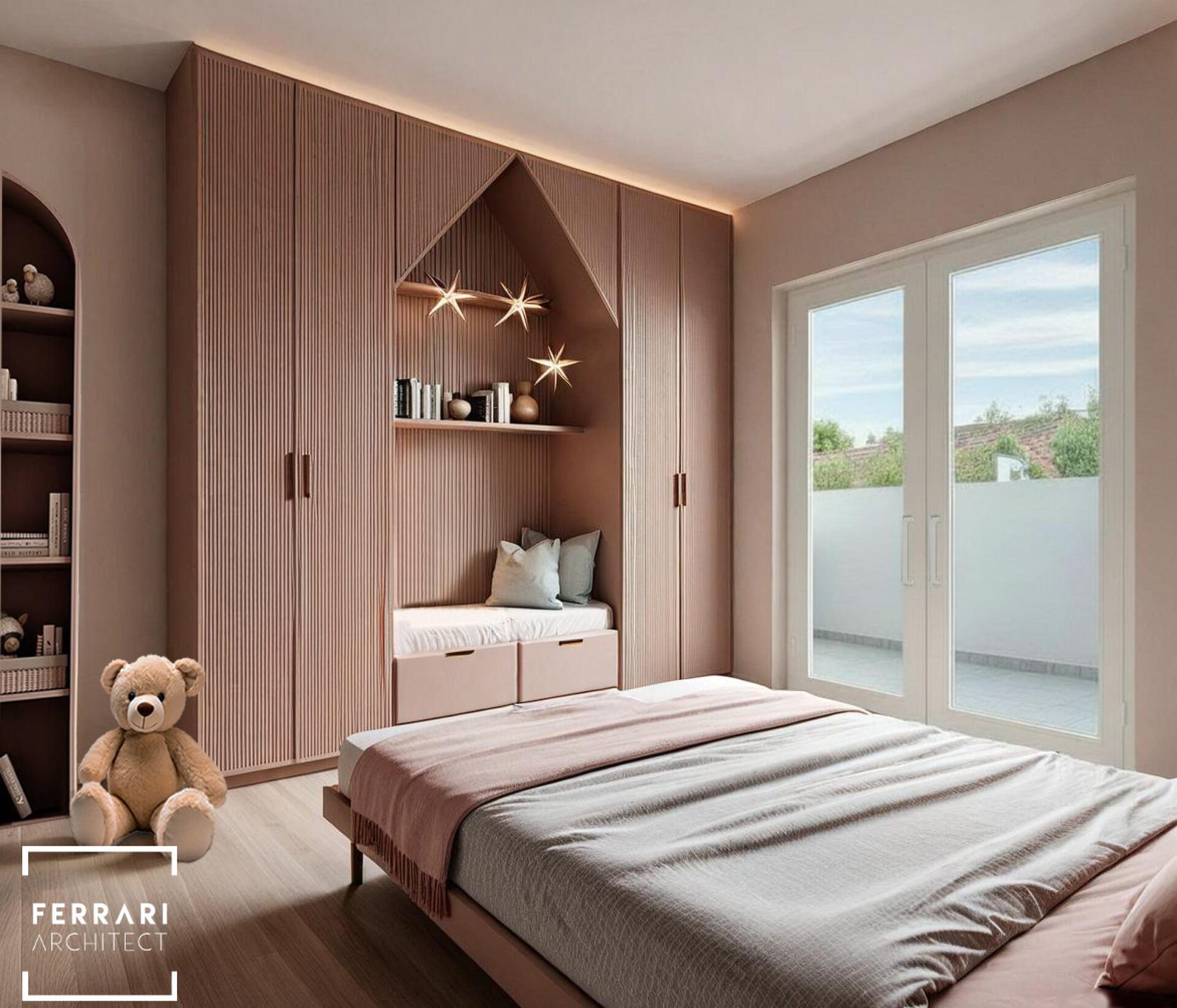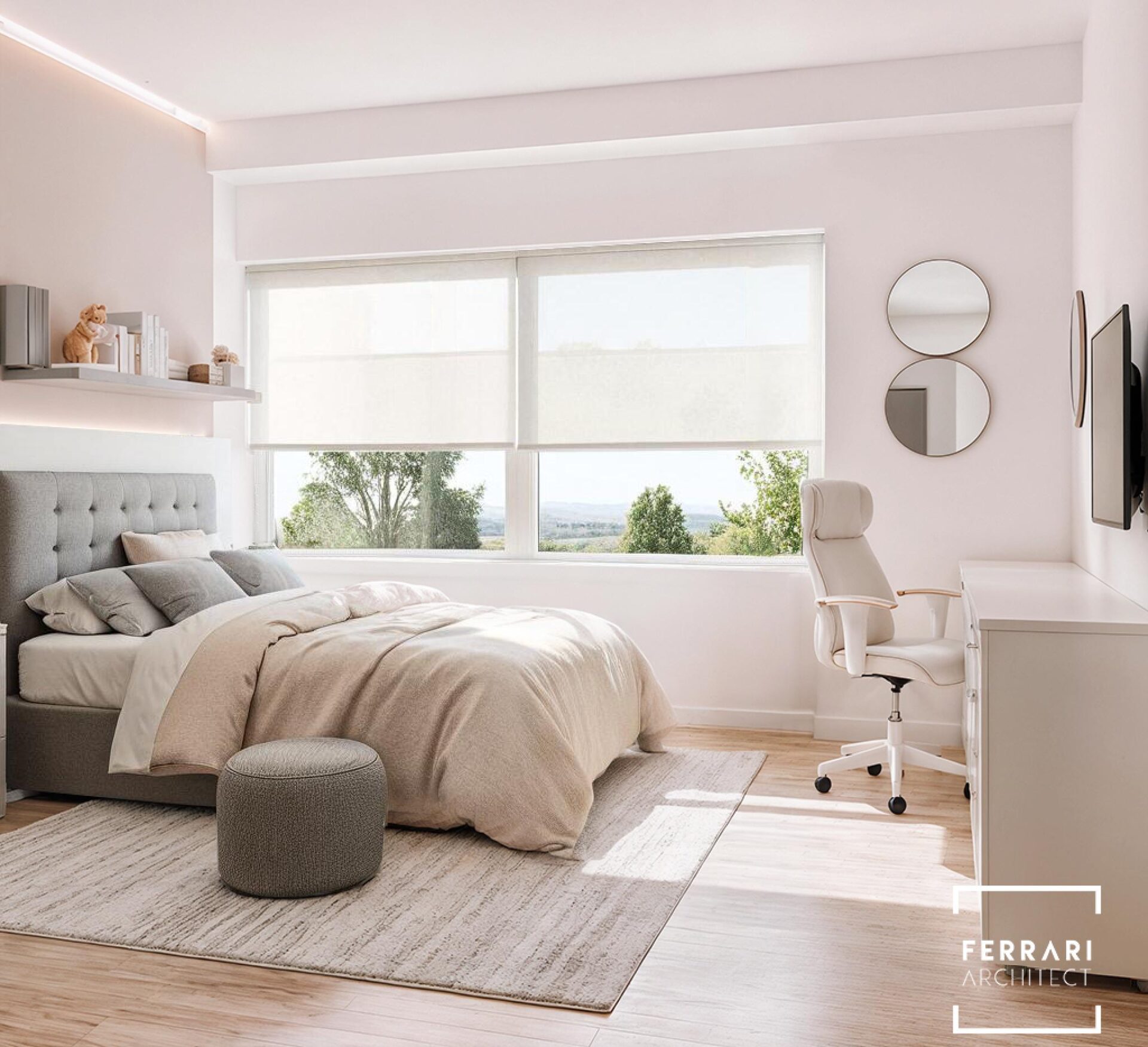 La CAMERA DA LETTO diventa un’oasi di relax, con tonalità neutre e calde, pavimenti in legno chiaro e tessili morbidi che invitano al comfort. Le ampie finestre con tende leggere favoriscono la luce naturale, mentre il letto imbottito e un grande tappeto soffice definiscono l’area notte. L’armadio a muro, integrato nell’arredo, mantiene linee pulite e finiture neutre, garantendo funzionalità senza appesantire lo spazio.