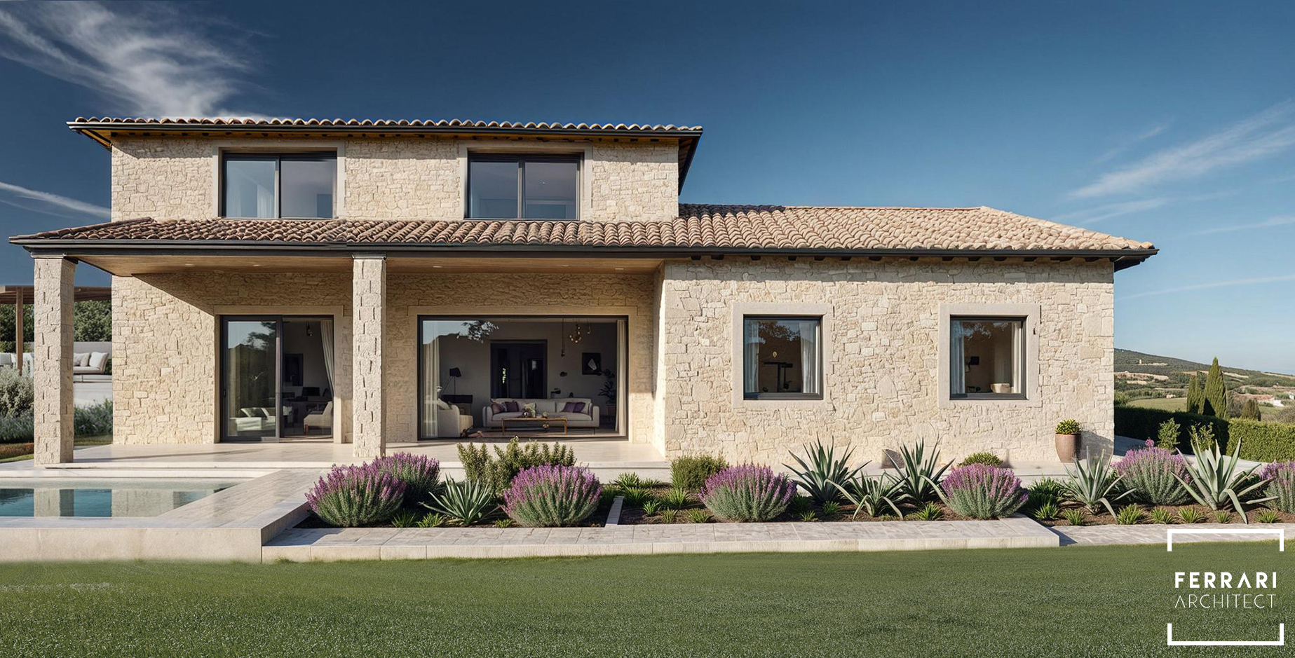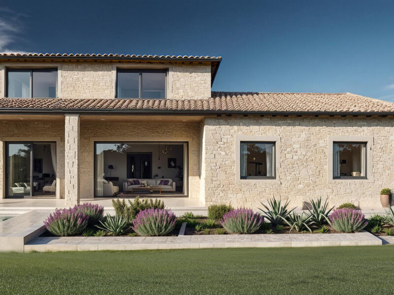 L’ESTERNO PRINCIPALE mostra una casa a due piani con facciata in pietra chiara, tetto in tegole e ampie vetrate scorrevoli che si aprono su un patio con piscina. Il GIARDINO, ricco di vegetazione mediterranea e fioriture viola, costruisce un’atmosfera naturale e raffinata, in equilibrio tra tradizione e contemporaneità. La VISTA LATERALE evidenzia lettini in legno, ombreggiature verdi e spazi pensati per privacy e relax; un’ulteriore prospettiva mette in risalto la matericità della pietra e la continuità visiva tra interno ed esterno.