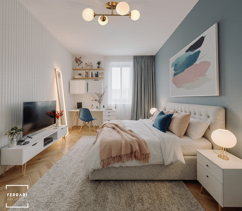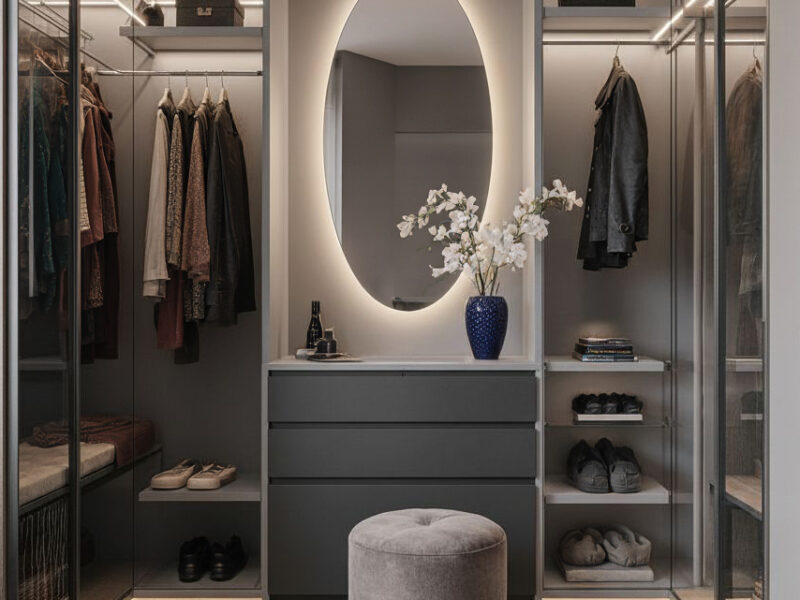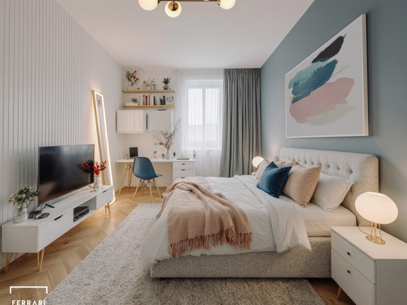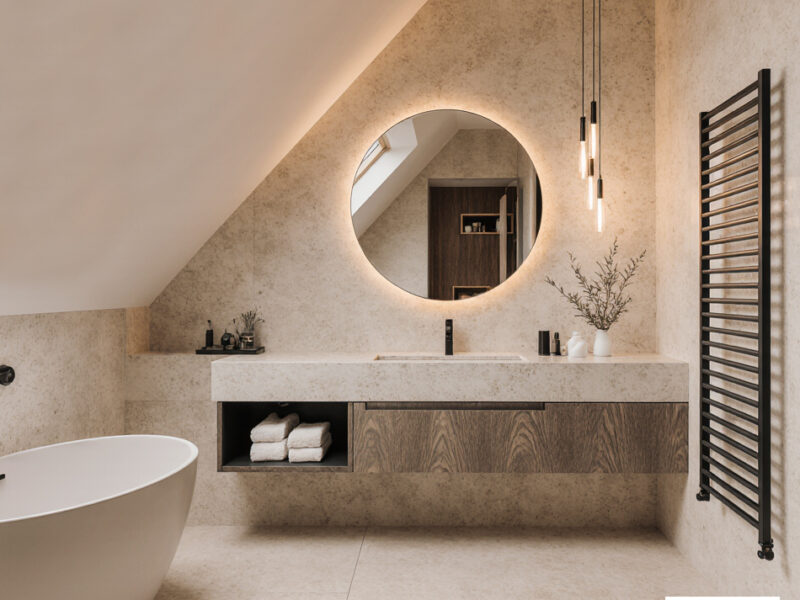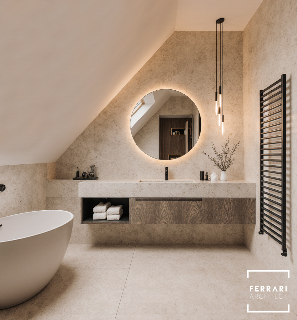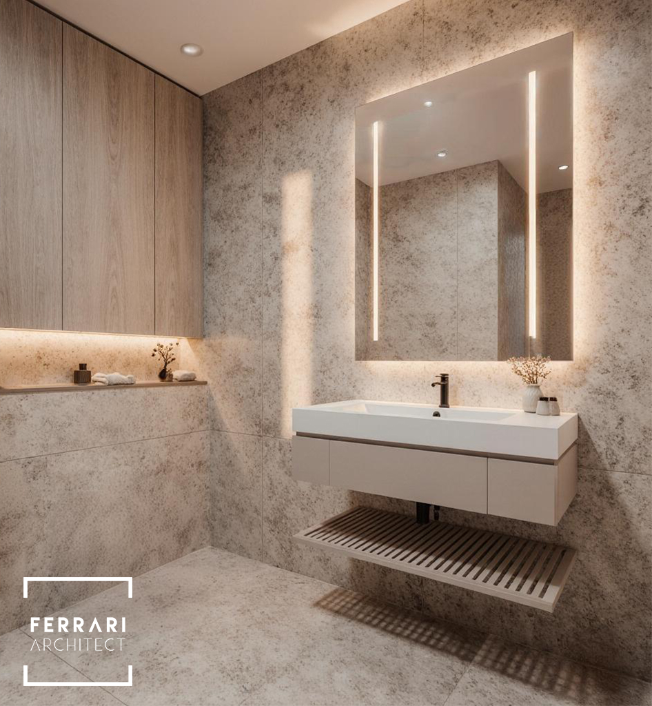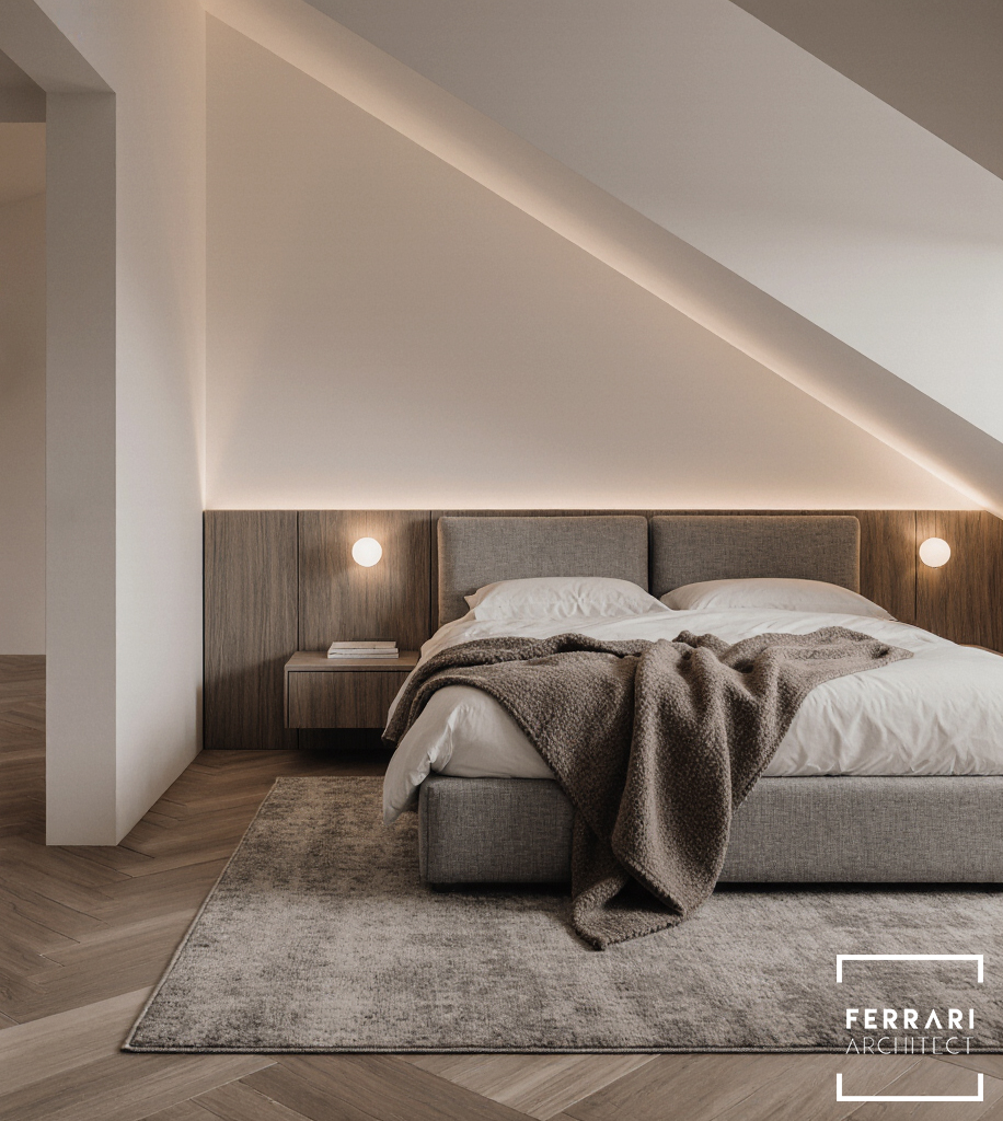 Gli interni mantengono un linguaggio elegante e minimale. Il PRIMO BAGNO utilizza pietra chiara venata, arredi sospesi neutri e illuminazione LED verticale per un ambiente luminoso e rilassante. Il SECONDO BAGNO, con soffitto inclinato, mobili in legno scuro e vasca freestanding, propone un’atmosfera sofisticata e suggestiva. La CABINA ARMADIO, definita da armadiature in vetro scuro, luce soffusa e un pouf centrale, unisce ordine, funzionalità ed eleganza.