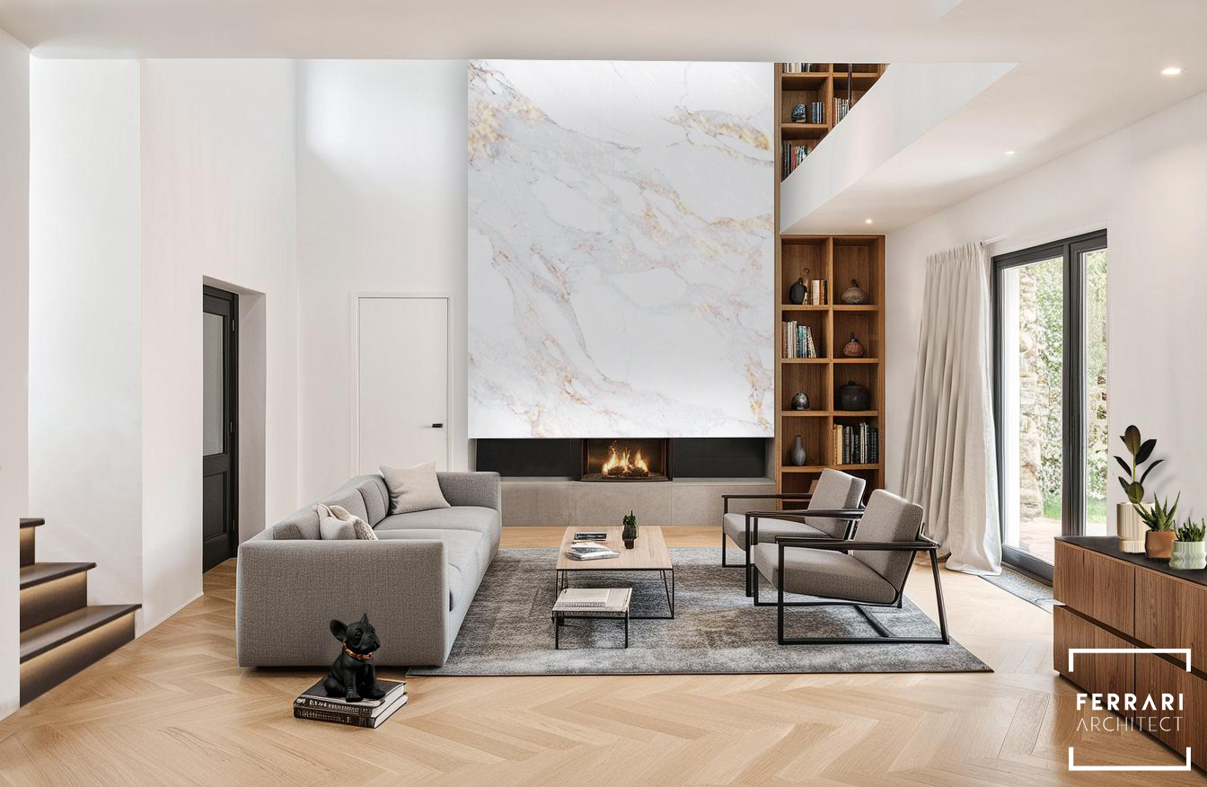 Le CAMERE DA LETTO adottano toni neutri e texture morbide: la prima sfrutta un letto grigio chiaro e una parete retroilluminata per creare un ambiente rilassante, mentre la seconda combina parquet a spina di pesce, letto imbottito e illuminazione moderna per un comfort intimo e armonioso. Il SOGGIORNO si apre sul giardino attraverso grandi vetrate, caratterizzato da parquet chiaro, arredi essenziali e un camino rivestito in marmo bianco che diventa fulcro della composizione.